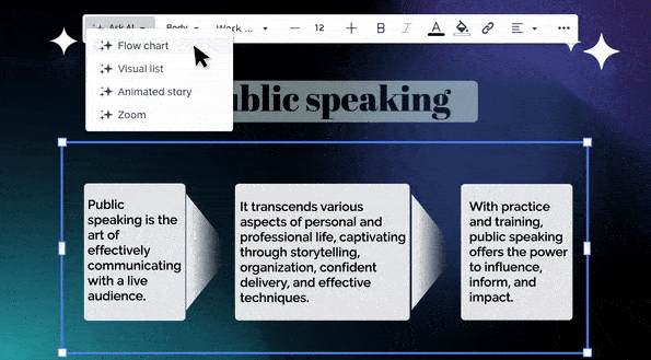 If you think in stories rather than slides, your choice here is critical. Beautiful.ai helps you build a clean, professional narrative slide by slide, ensuring each part is well-designed. It’s great for creating a polished, linear story. Prezi, on the other hand, is built for a different kind of narrative. With Prezi AI, you can move beyond simple slides and create fully designed presentations from just a few core ideas. It helps you transform text into different visual stories , like flow charts and animated paths, making it easier to show the relationship between concepts instead of just telling your audience about them.